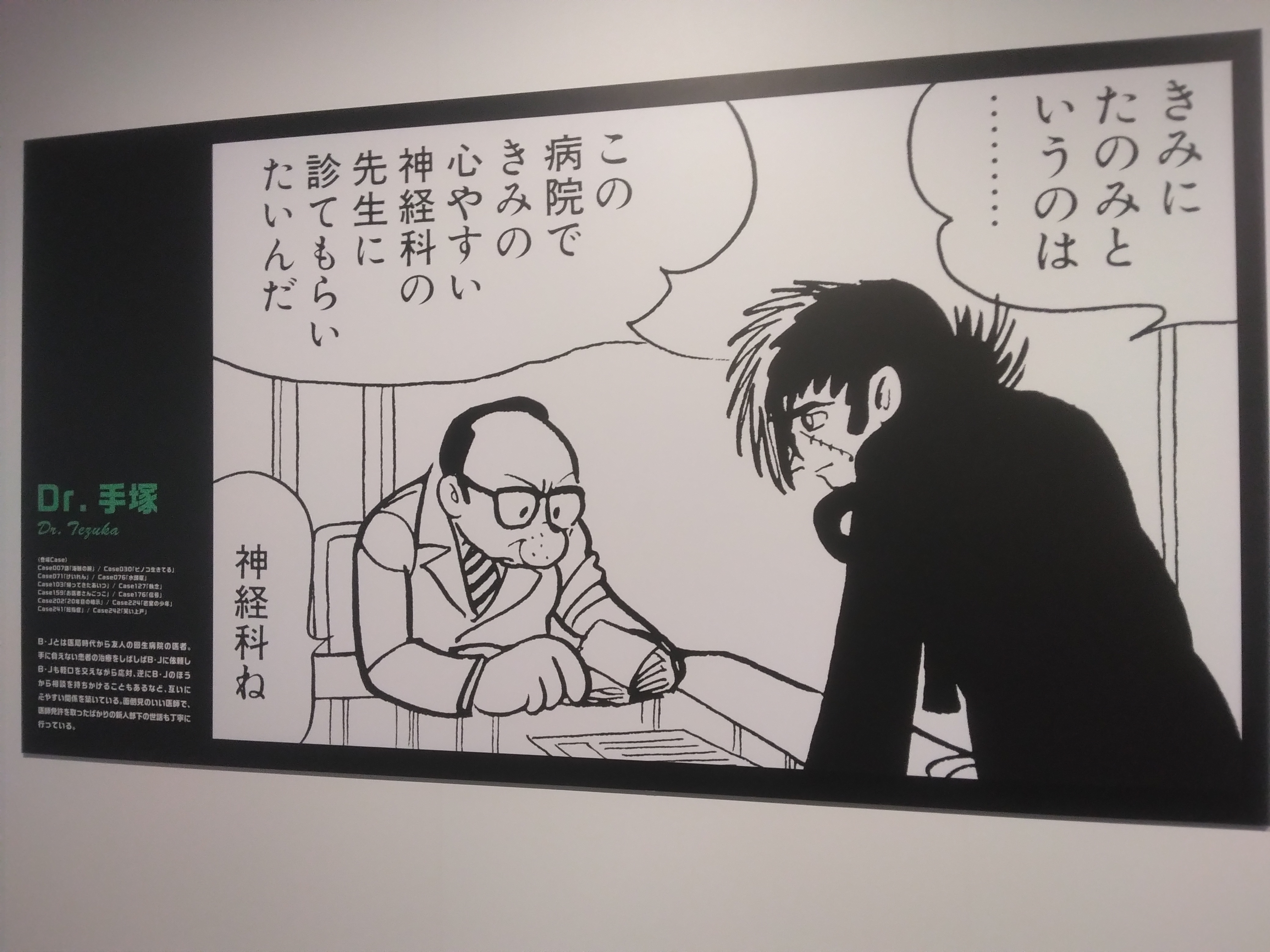 ブラックジャックを知らない世代の為、ダイジェストのようにストーリーがわかりやすく纏められ、その原稿が飾られていました。私自身、社会人になってから貸してくれたOさんにより深く知ることが出来たのでついつい読んでしまって…本当に考えさせられる面白いストーリーです。